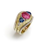 18ct White and Yellow Gold Cocktail Ring set with natural pink Tourmaline, natural Blue Sapphires and natural Diamonds: