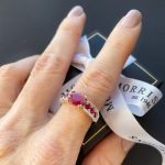 Gemstones: One oval 2.20ct Ruby at its centre, three round Rubies on each side: total weight of the six: 0.51ct