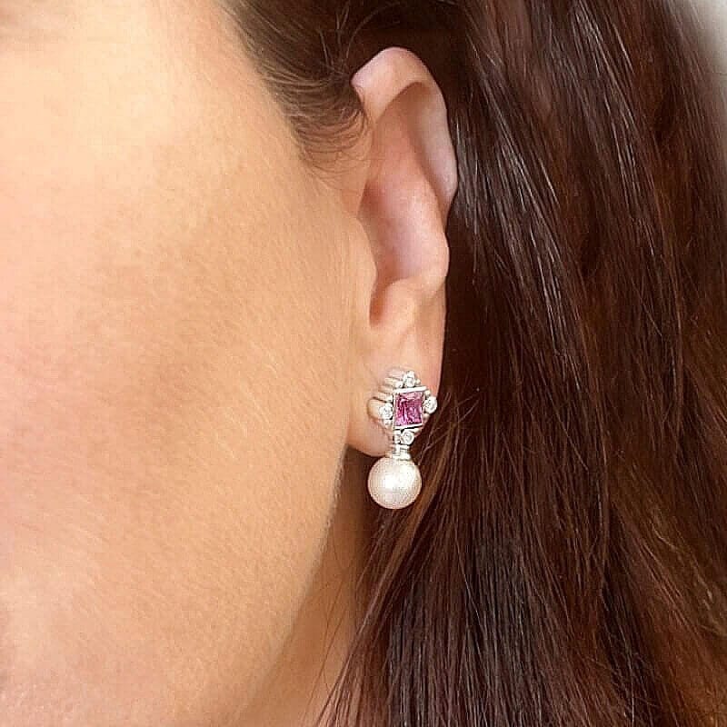Intense natural Pink Sapphires paired with Diamonds and Pearls. Premium, handmade earrings at their finest. A very special pair of earrings for a very special occasion. P.O.A