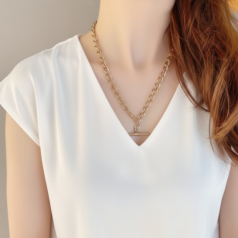 Dimensions: Necklace: 7 mm wide by 3 mm thick by 53 cm long including T-bar