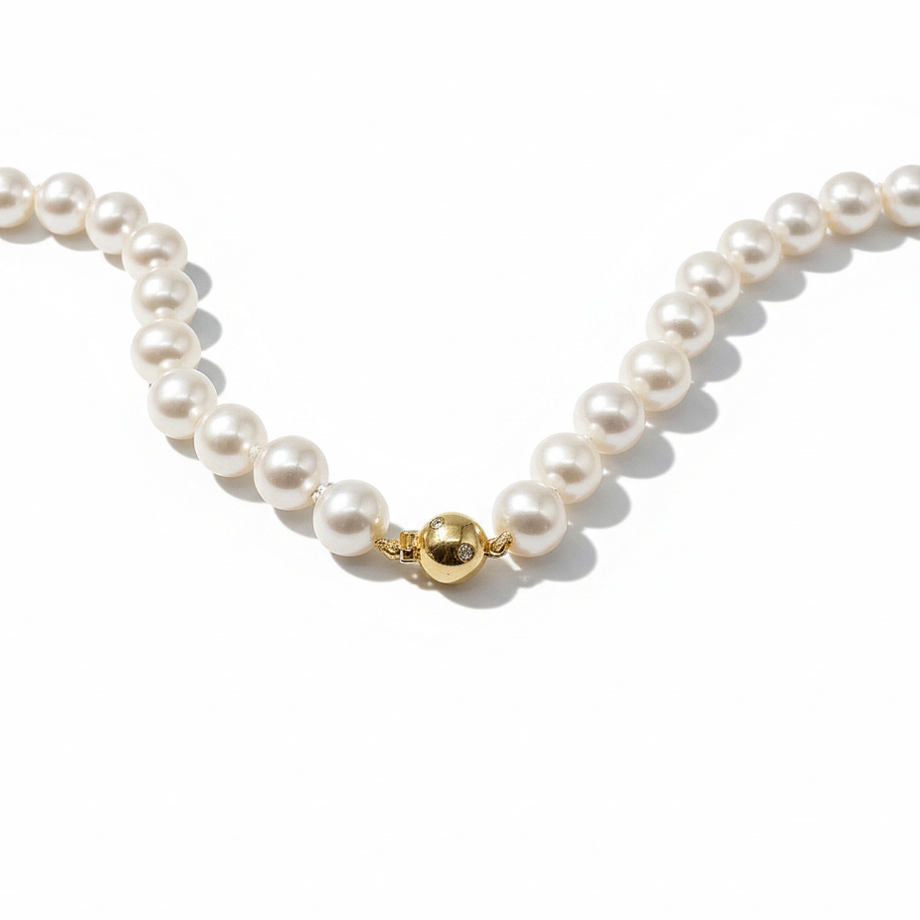 High lustre, large pearls because it matters to you that your pearls are real. Strung on pearl silk with a delicious solid gold diamond clasp.
