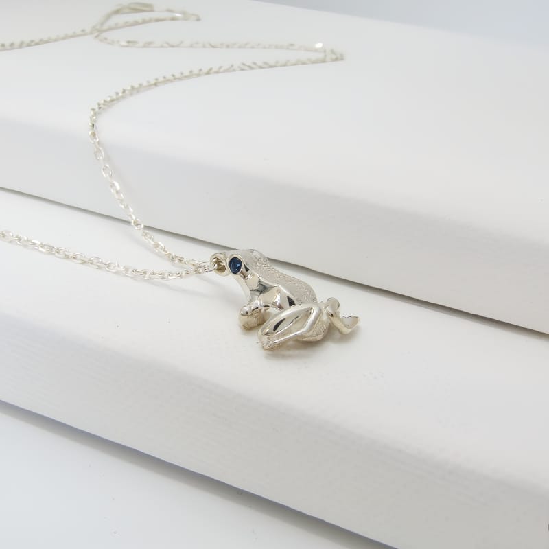 Solid 925 sterling silver frog pendant set with natural blue sapphires on a 925 sterling silver Forzantia-link necklace: