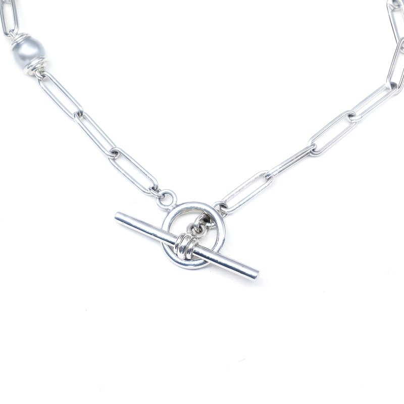 Solid 925 sterling silver rhodium plated paperclip-link necklace with toggle clasp and pearl detail (heart pendant not included):
