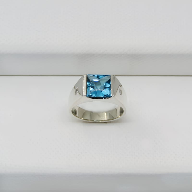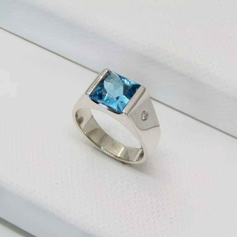 Gemstones: An 8X8mm buff-cut Swiss Blue Topaz and two brilliant-cut natural Diamonds, total weight: 0.06ct, colour: H/I, clarity: VS SI.